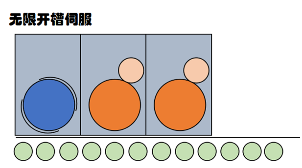 無限開槽應用在瓦楞紙水墨印刷機的后段,開槽部分。主要實現(xiàn)的是成產(chǎn)紙板長度大于開槽周長的超長箱型,運動控制采取凸輪動作來實現(xiàn)該效果。